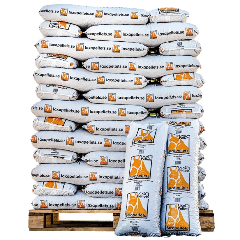 Ströpellets av gran och tall – en praktisk och hygienisk lösning för hästboxar, kattlådor och andra stallmiljöer. En pall innehåller 52 säckar à 16 kg, totalt 832 kg.
